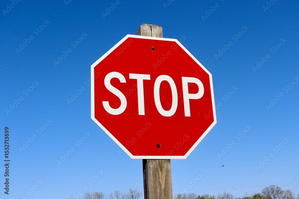 Bild auf Leinwand A close view on the red stop sign with a blue sky.