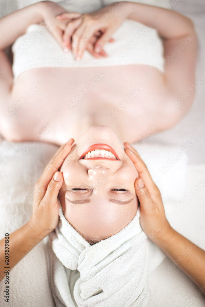 Bild auf Leinwand Adult european wealthy woman getting anti-aging face-lifting massage relaxing after working day