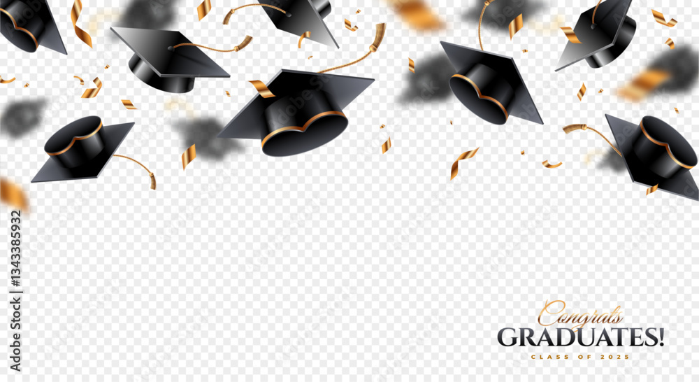 Foto Banner with graduation caps or toga hats tossed up and golden foil confetti on a transparent background