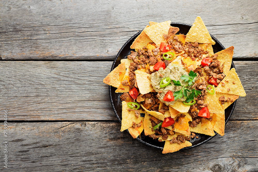Foto Corn chips nachos with fried minced meat and guacamole on wooden background