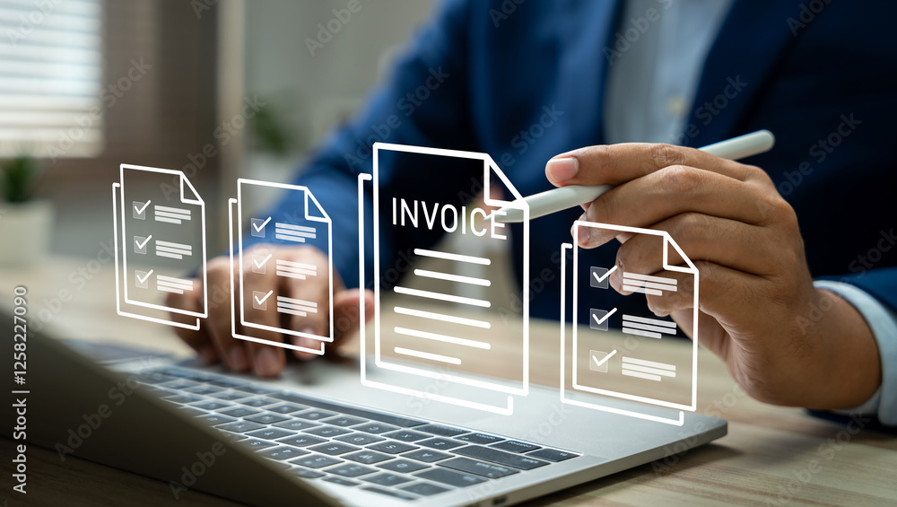 Foto E-Invoice and Digital billing concept, Businessman using laptop to manage electronic statements on virtual screen