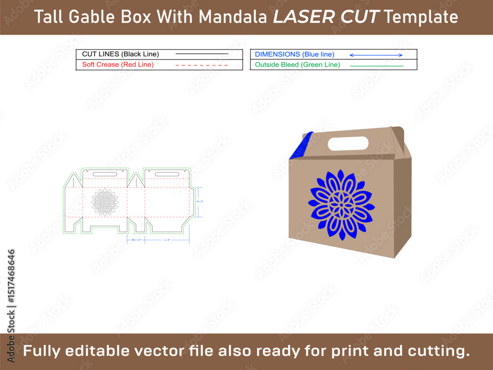 Foto Tall Gable Box Dieline Template with Mandala Pattern laser Cut