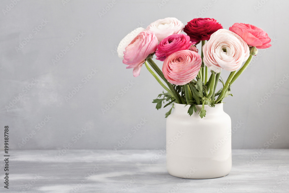 Foto Bouquet of pink and white ranunculus flowers over the grey wall