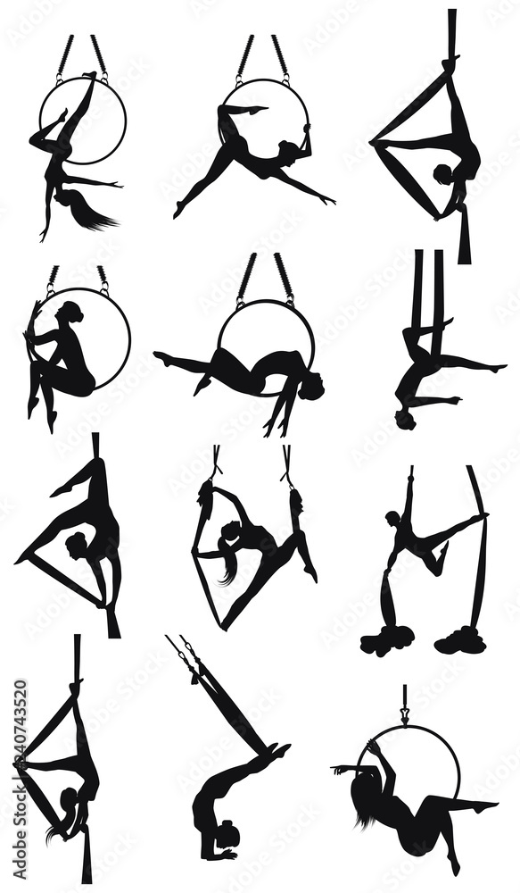 Foto Set - aerial gymnastics - twelve female silhouettes on the rings and on the hamm