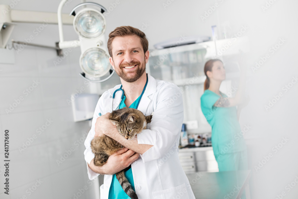 Foto Portrait of smiling doctor carrying cat while standing against coworker at veter