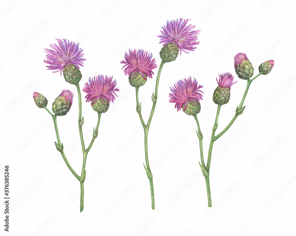 Foto Set of the field thistle flower ( Cirsium arvense, creeping thistle, way thistle, small-flowered)