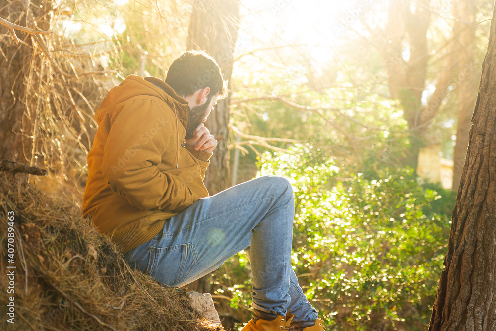 Foto Young man sitting in a Mediterranean landscape forest with sun in background and