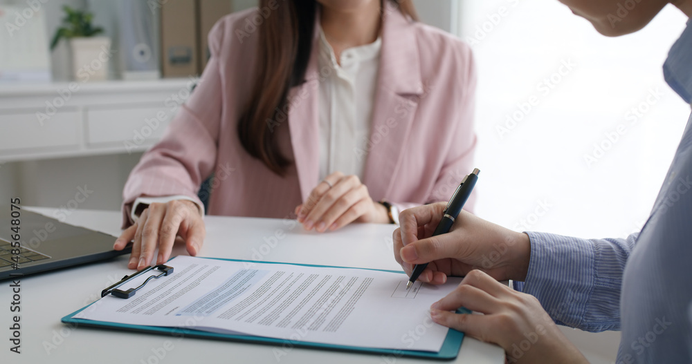Foto Close-up hand asia people woman fill rent loan form write legal debt letter at lawyer home office