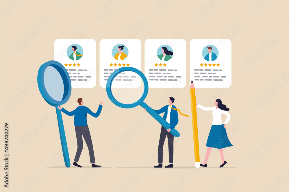 Foto Recruitment hiring process to choose candidate to fit job position, HR Human Resources recruiting people fill in vacancy concept, business people HR with magnifier to choose choose candidate resume