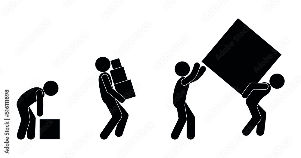 Foto loader icon, man carries boxes, cargo delivery illustration, stick figure human