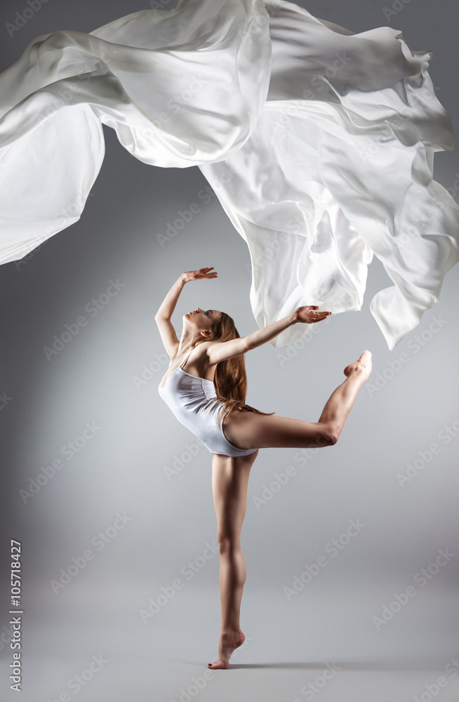 Fototapete beautiful young girl dancing. Flowing fabric.
