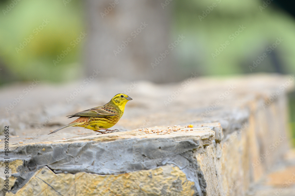 Fototapete A small yellow bird perches on a weathered stone step, bathed in natural light and surrounded by a rustic outdoor setting