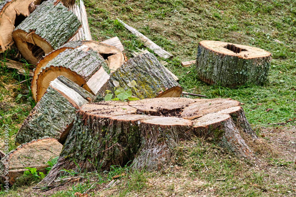 Fototapete Tree stump and cut logs in a woodland area during daytime showing recent tree re