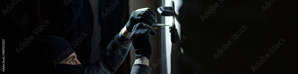 Fototapete Burglar wearing black mask and gloves picking door lock with metal tool in dark