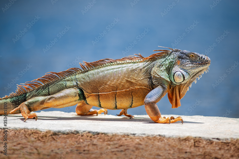 Fototapete An adult green American iguana walking outdoors by himself on a grey stone wall next to water during a warm summer day