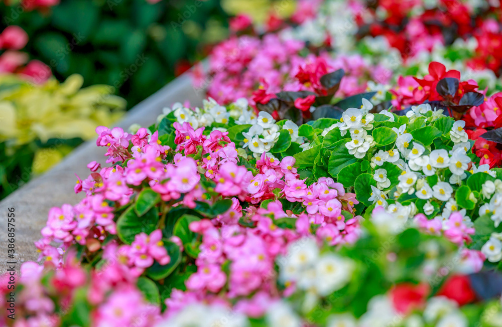 Fototapete Depth of field of colorful semperflorens begonia flower blossom in flower garden
