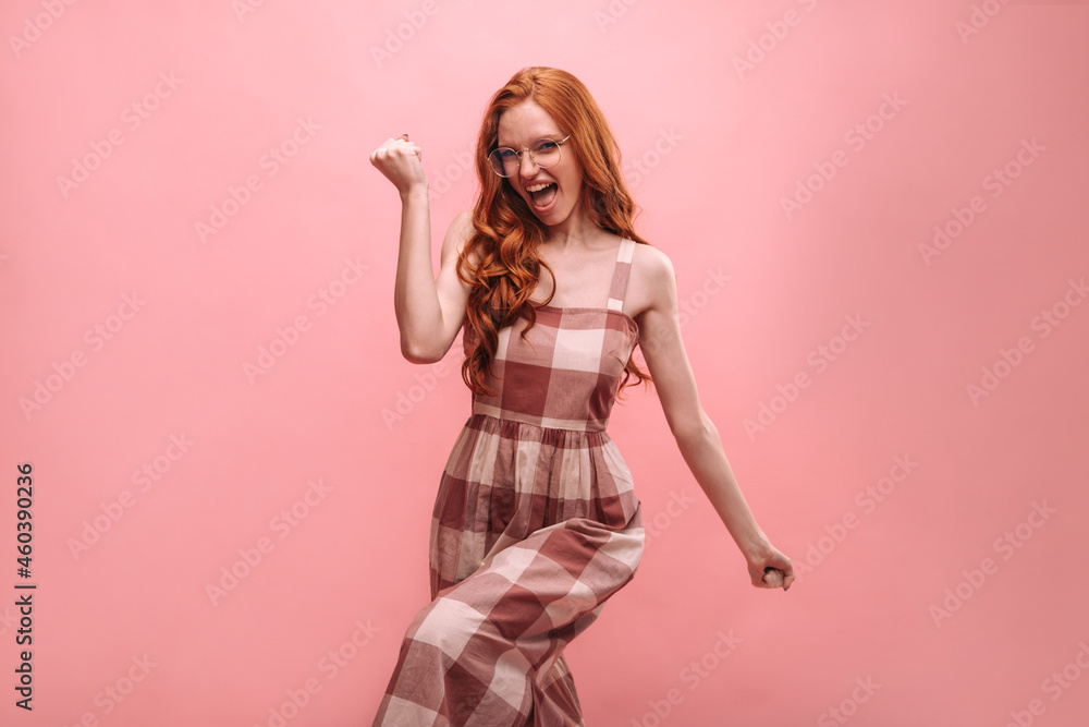 Fototapete Young slim european girl with red long hair, joyful on pink background