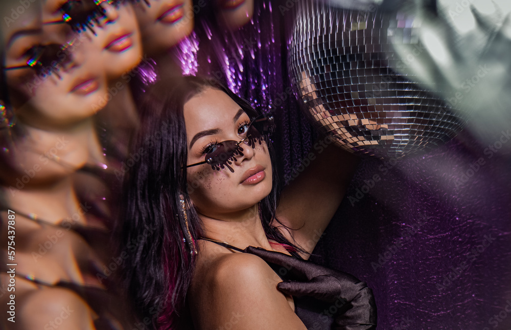 Fototapete euphoria inspired editorial photo shoot glitter background purple black model ca