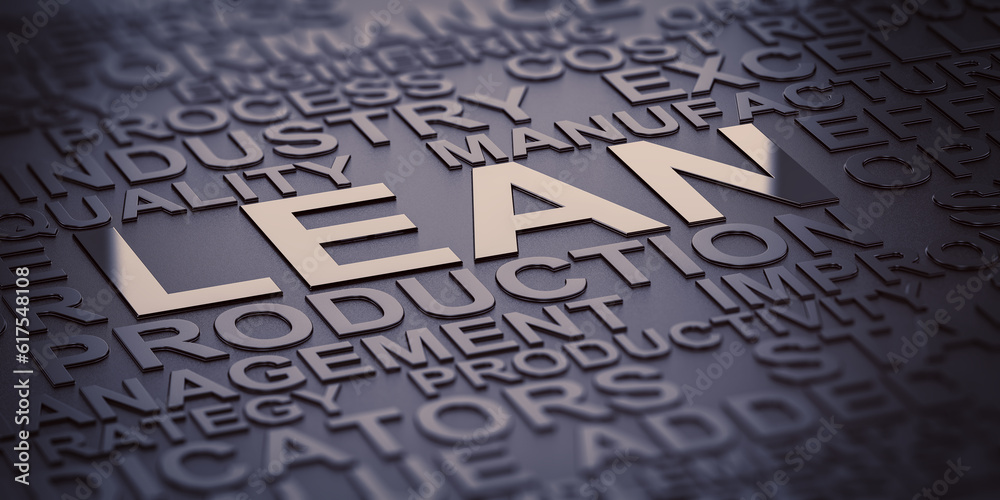 Fototapete Many words over black background with reflection and blur effect, focus on the words lean and production