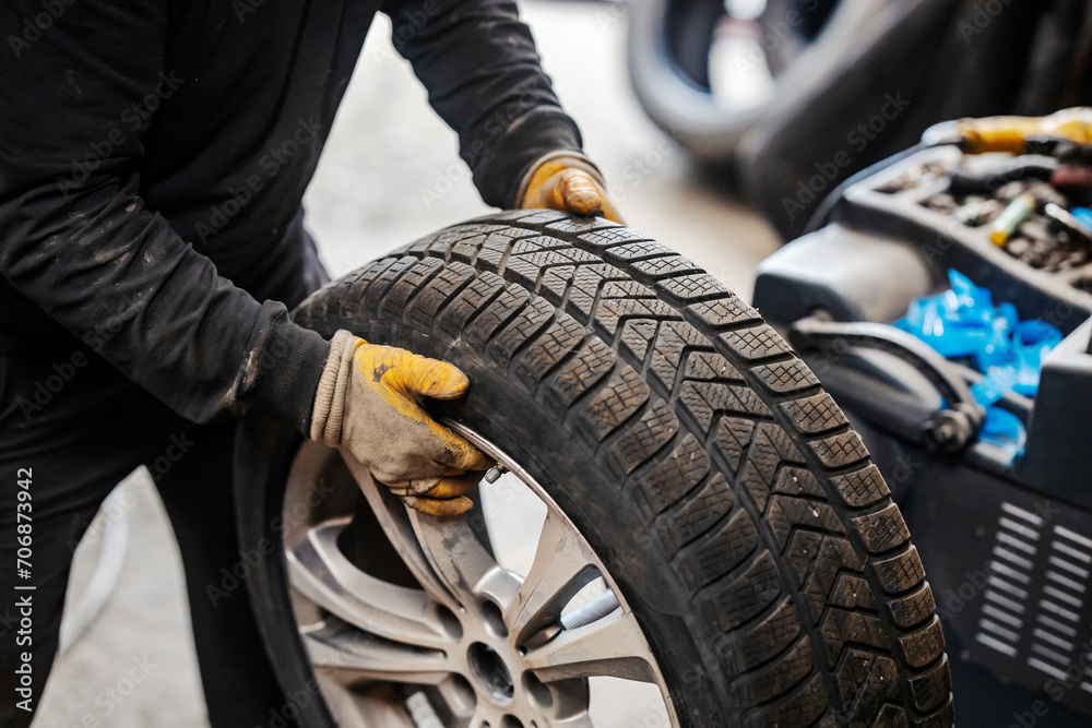 Fototapete Close up of mechanic's hands holding car wheel at vulcanizing workshop