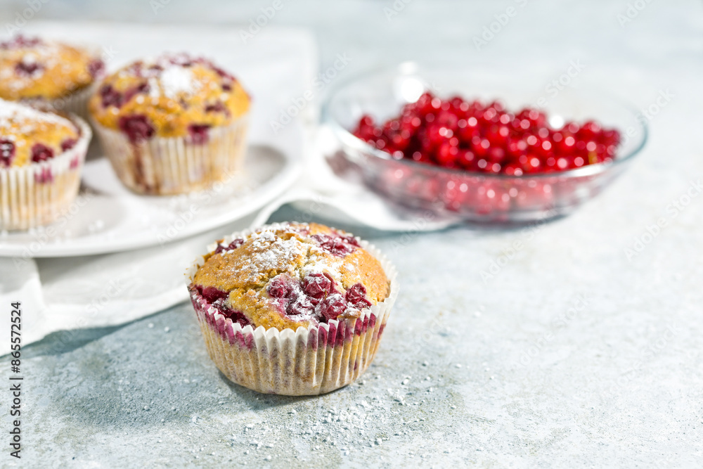 Fototapete Homemade muffins baked with red currants and sprinkled with powdered sugar, frui