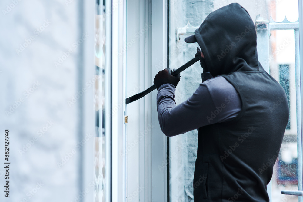 Fototapete Man, criminal and crowbar for house crime, home invasion and breaking entering attempt with tool
