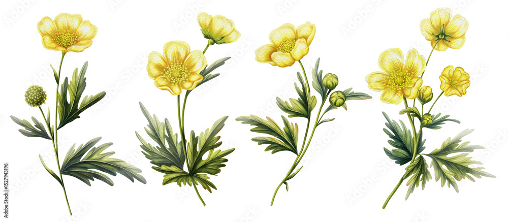 Foto Illustration set of 4 buttercup flowers in watercolor style