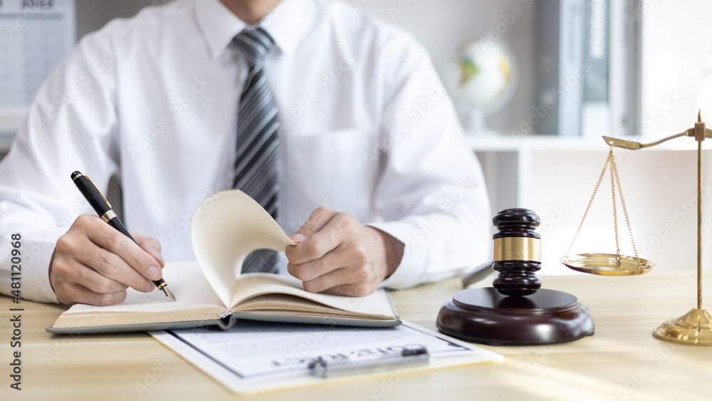 Foto Lawyers or judges sign documents in accordance with legal and fair terms of agreement, Legal Ethics and Integrity, scales of justice, law hammer, Litigation and legal services