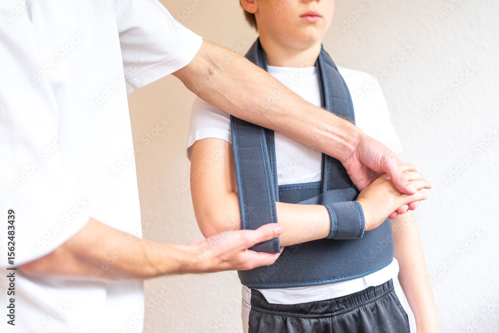 Bild auf Leinwand Teen boy in an orthopedic sling, Medical professional fitting therapeutic suppor