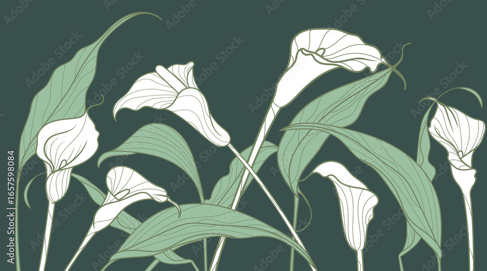 Bild auf Leinwand Green luxury art background with lminimalistic calla flowers in line style