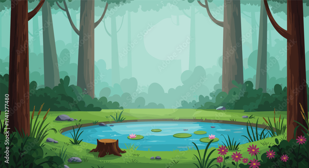 Bild auf Leinwand Peaceful forest pond with lily pads, pink flowers, tree stump, lush greenery, ro