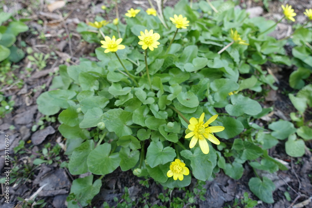 Bild auf Leinwand Couple of yellow flowers of lesser celandine in April
