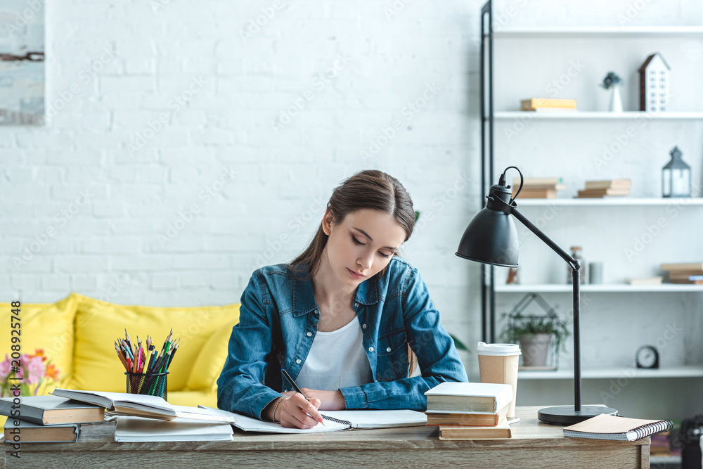 Bild auf Leinwand concentrated teenage girl writing and studying at desk at home