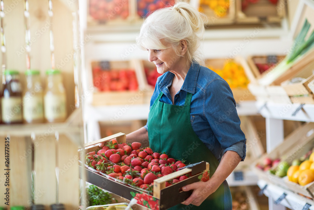 Bild auf Leinwand Shop assistant holding box with fresh strawberries in organic produce shop