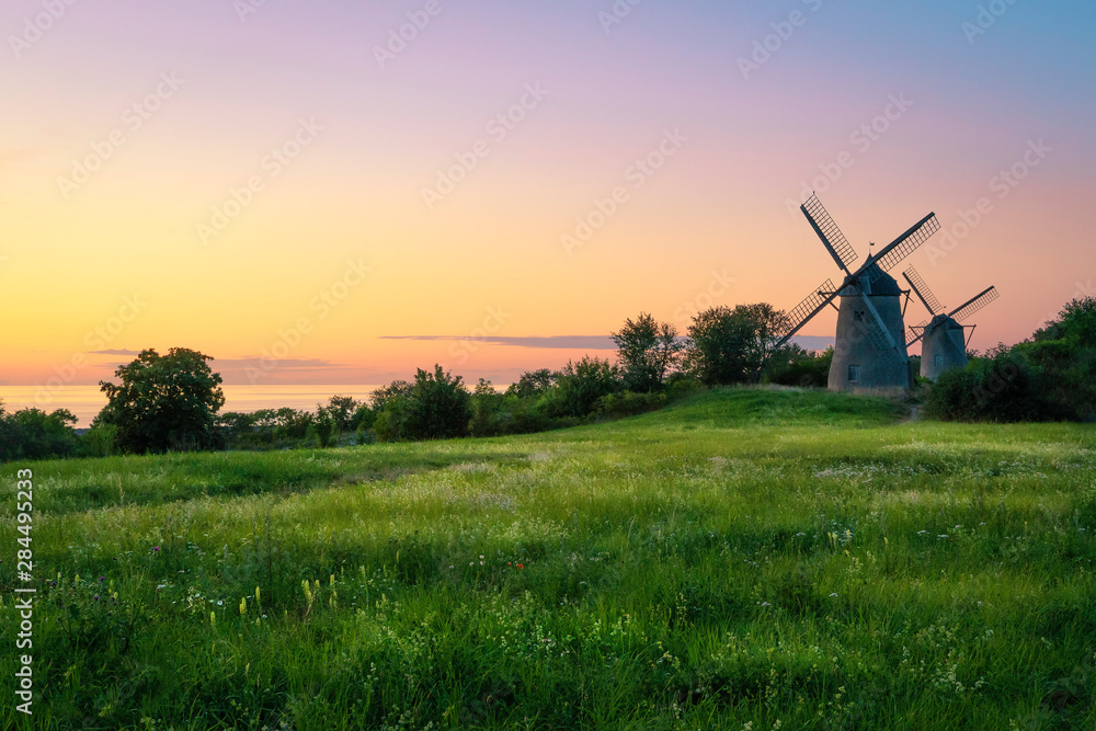 Bild auf Leinwand Windmühlen im Sonnenuntergang