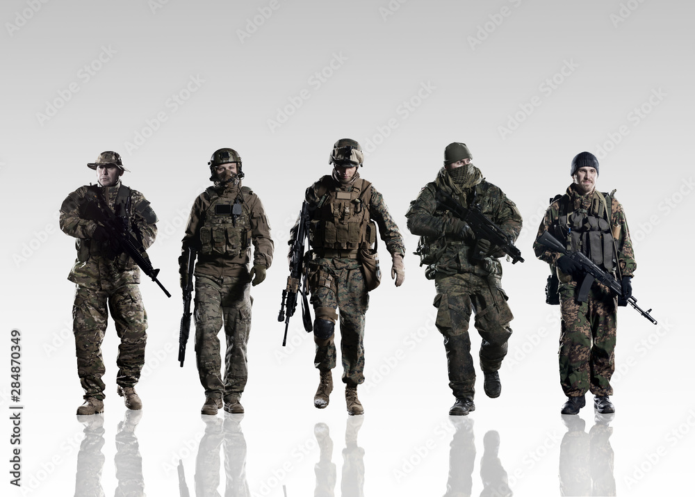 Bild auf Leinwand Five soldiers of different armies on the smooth floor.