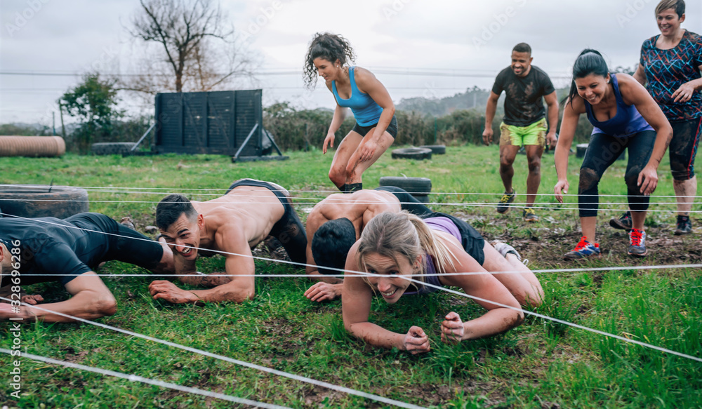Bild auf Leinwand Group of participants in an obstacle course crawling under electrified cables