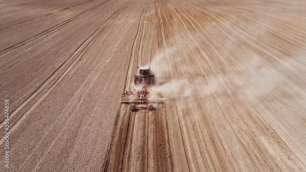 Bild auf Leinwand Farmers cultivating. Tractor makes vertical tillage. Aerial view