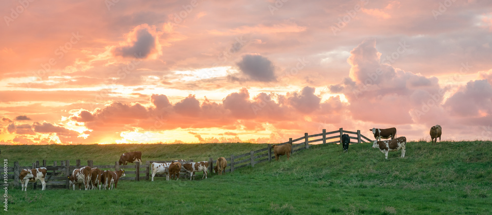 Bild auf Leinwand Panorama view of grazing cows on a dike in Holland during a beautiful sunset