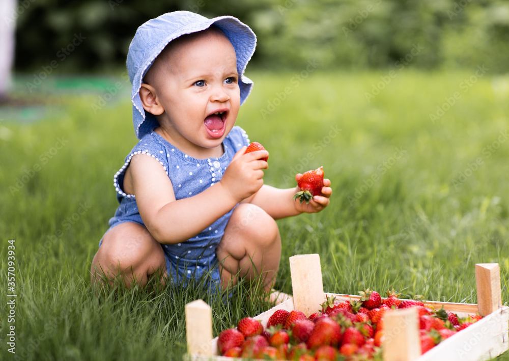 Bild auf Leinwand baby girl sits in a meadow and eats strawberries