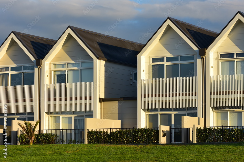 Bild auf Leinwand Modern townhouses with gable roofs without overhangs and small yards in front