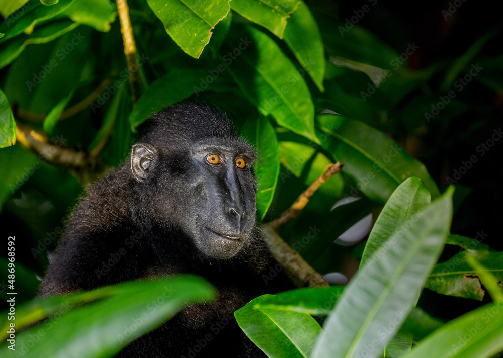 Bild auf Leinwand Portrait of celebes crested macaque among the leaves of a tropical forest