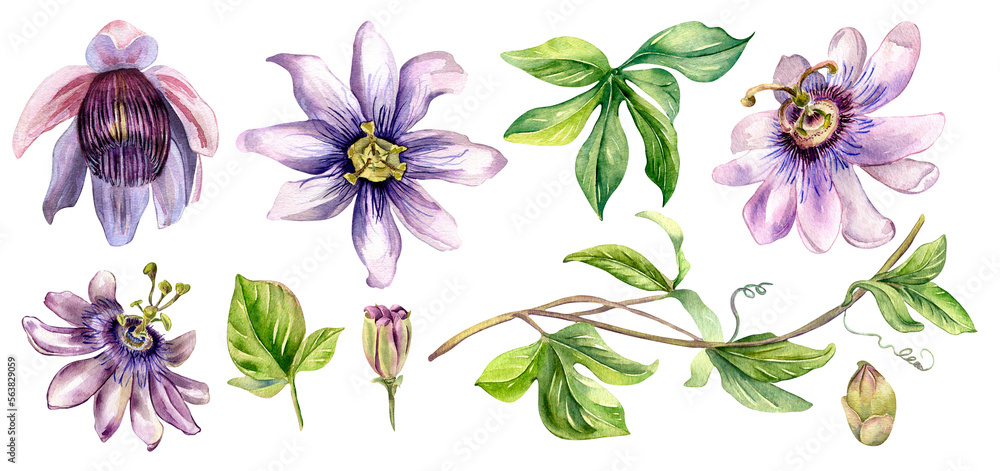 Bild auf Leinwand Set of passion flowers, leaves watercolor illustration isolated on white