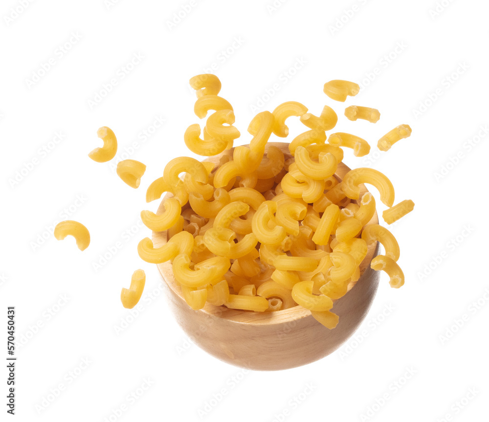 Bild auf Leinwand Macaroni fall on wooden bowl, yellow macaronis pasta float explode, abstract cloud fly
