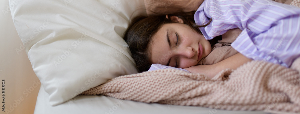Bild auf Leinwand Close-up of teenage girl sleeping in her bed.