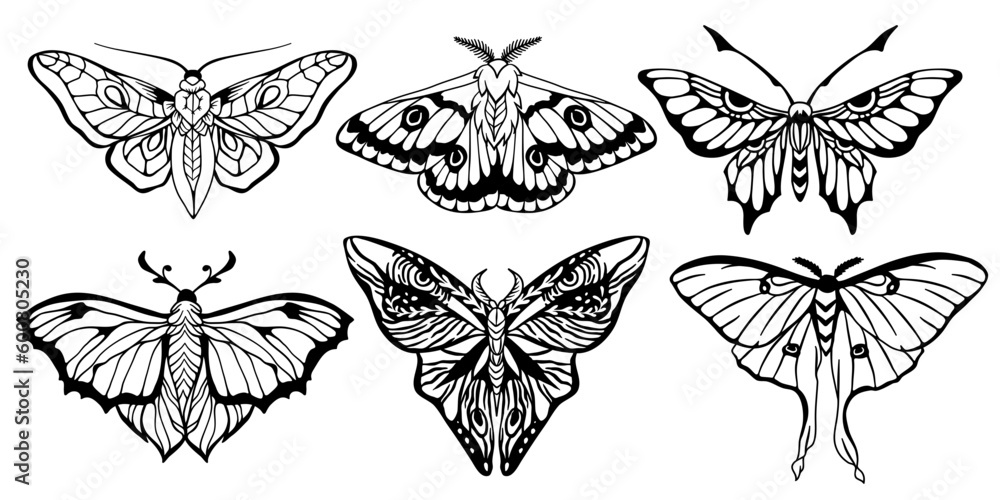 Bild auf Leinwand Set of six hand drawn moths. Vector design.