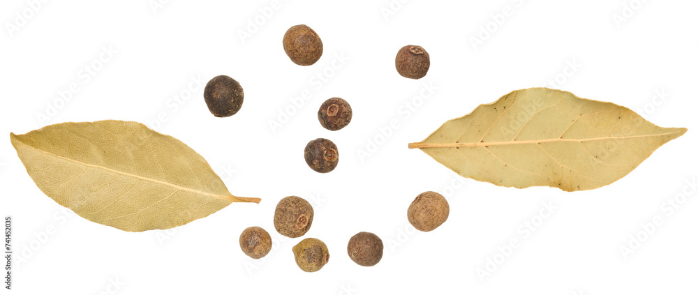 Bild auf Leinwand Bay leaf and allspice peas on isolated background, top view.