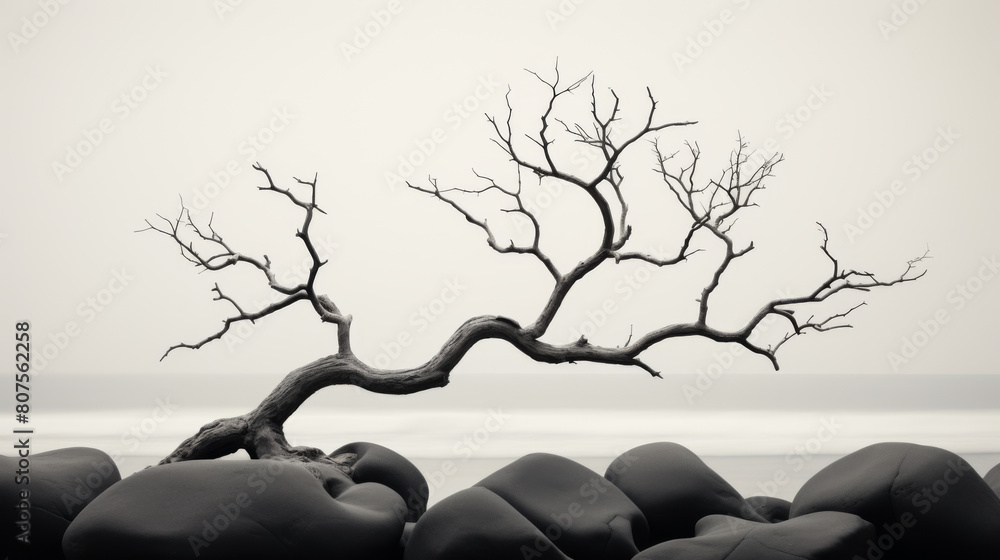 Bild auf Leinwand A tree with no leaves is leaning on a rock