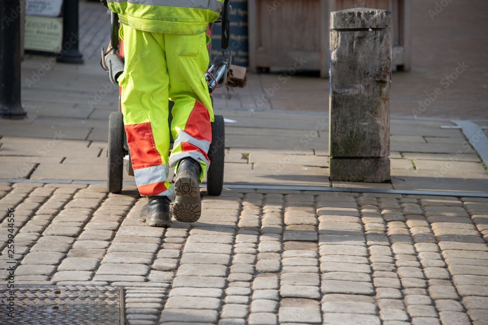 Foto litter collector working for the local council walks along street with barrow fo