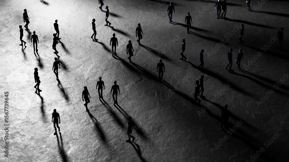 Foto Miniature figurines of people walking forward with long shadows cast by dramatic